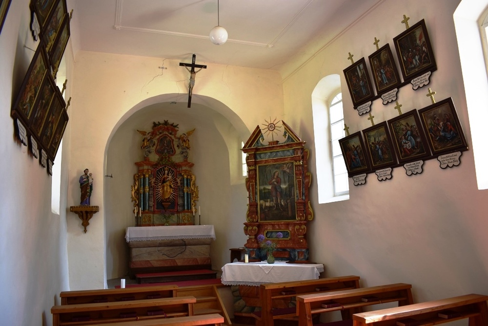 Die Nordwand weist ein, die Südwand zwei Flachbogenfenster auf. Im Westen eine Empore mit Aufgang. Die Sakristei ist im Turmgeschoß eingebaut und weist ein Kreuzgratgeölbe auf.