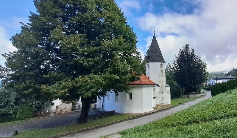 Es handelt sich um einen Rechteckbau mit 3/8 Chor unter einem gemeinsamen Satteldach. Im Westen ist ein Rundbogendurchgang durch den bis 1953 die Straße führte. Der Turm im Norden weist ein achteckiges Obergeschoß mit 4 Rundbogenschallöffnungen auf. Gekrönt wird er von einem Spitzhelm. Der Betraum mit Flachdecke über Hohlkehle, eingezogener Chorbogen, der Chor stark erhöht mit Gewölbe.