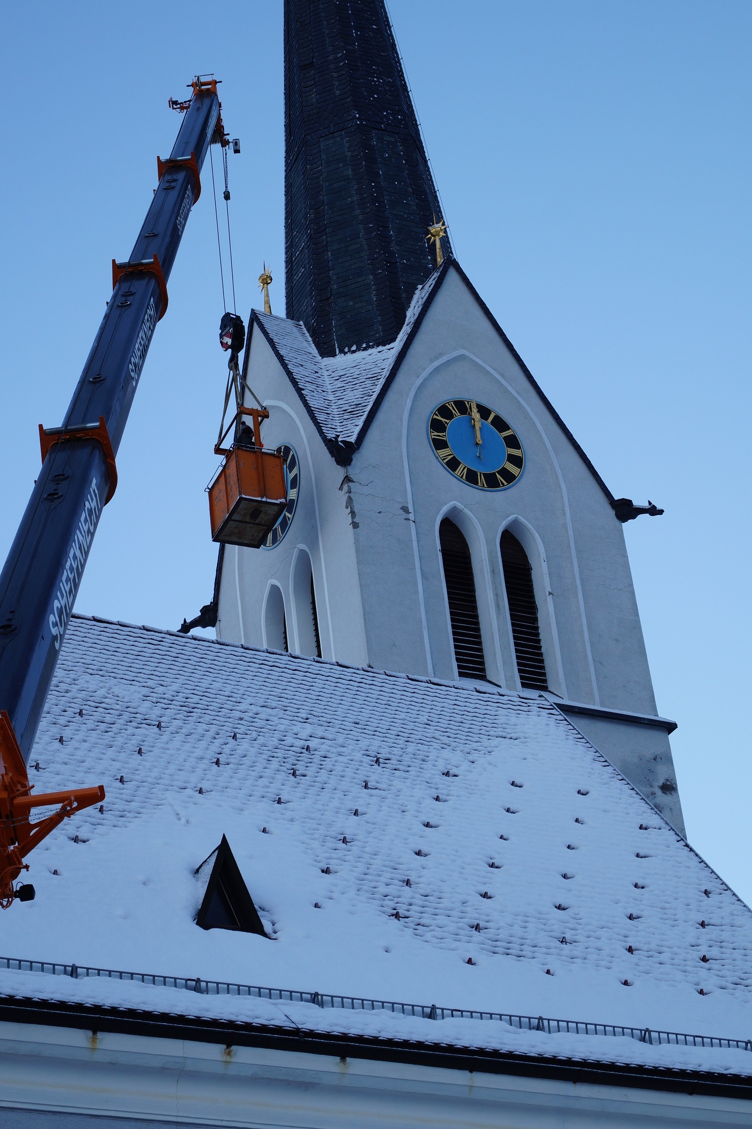 Die Turmuhr unserer Pfarrkirche zum hl. Jakobus wurde schon vor einigen Wochen nach einem längeren Ausfall wieder in Gang gesetzt. Lediglich auf der Südseite des Turms wollten die Zeiger nicht mehr ihren Auftrag erfüllen. Mit einem Steiger der Fa. Scheffknecht aus Lustenau hat sich der Uhrmacher im Dezember am Morgen früh hinaufheben lassen. Dabei zeigte sich, dass die Antriebsachse für die Zeiger kaputt waren und ausgewechselt werden mussten. Bereits zur Mittagszeit übernahmen die Zeiger wieder ihre gewohnten Aufgabe und drehen sich nun ordnungsgemäß.
