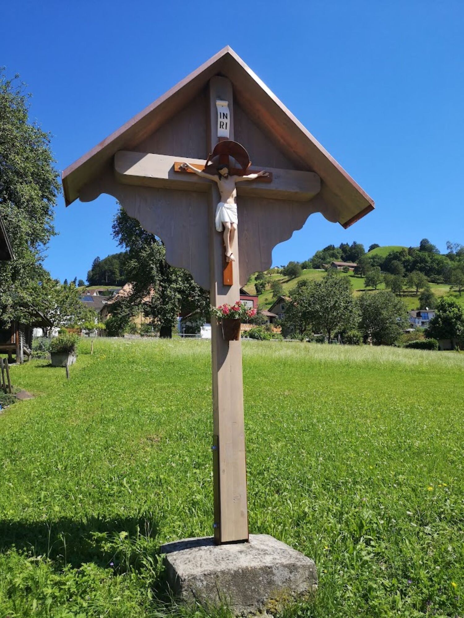 Das Feldkreuz am Eggweg, gleich nach dem Gemüsegarten von Ludwina Nägele, steht bereits seit Jahrzehnten an diesem Platz und hat in dieser Zeit manchen Wanderer oder auch Landwirt, der daran vorbei gekommen ist, zu einem guten Gedanken angeregt.