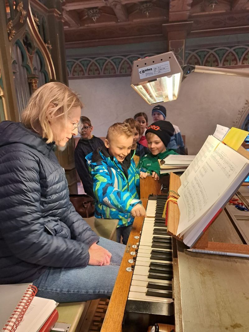 Bei der Kirchenführung mit unserer Gemeinde-leiterin, trafen die Kinder spontan unsere Organistin Waltraud. Die Kinder durften der Königin der Musikinstrumente verschiedene Töne entlocken und unser Nachwuchsorganist Gergö spielte uns auswendig ein Lied vor.