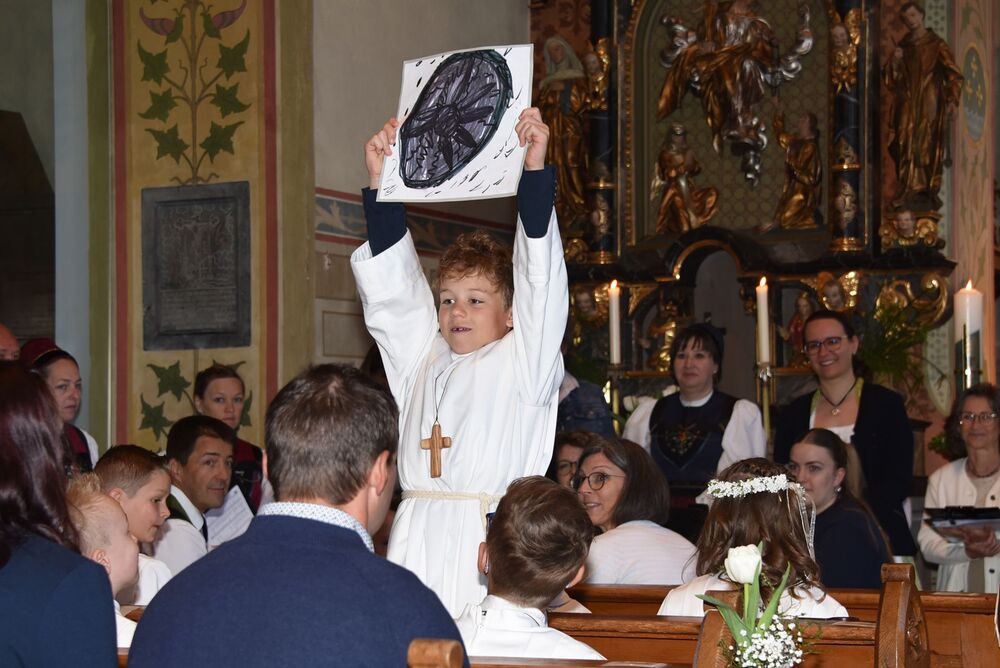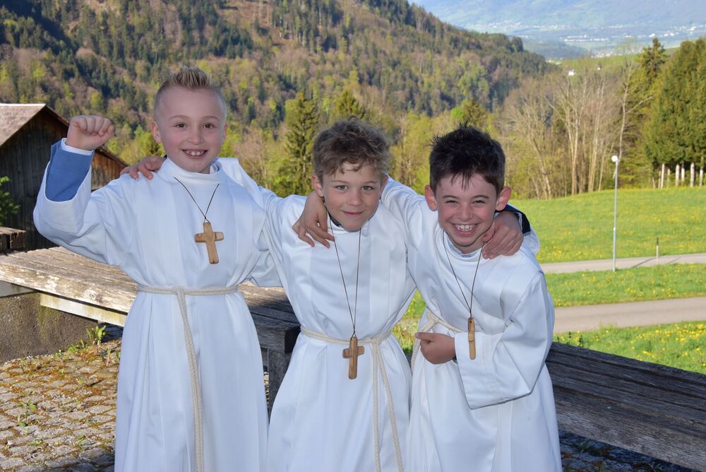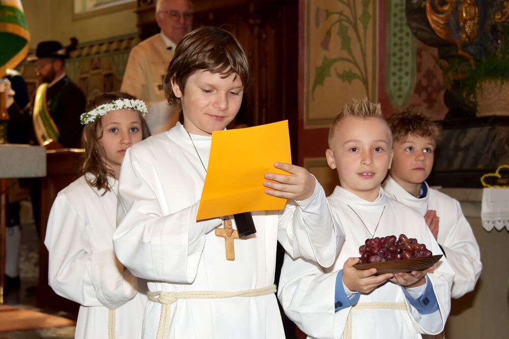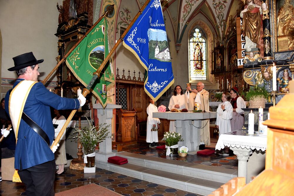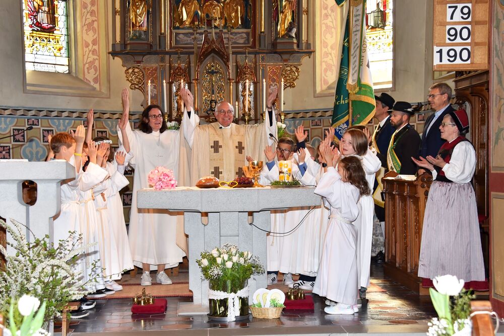 sommerlichen Temperaturen und s’Laternser Chörle, die Schützen, der Trachtenverein und der Musik-verein standen ebenfalls schon parat. Somit stand dem festlichen Einzug in die Pfarrkirche nichts mehr im Weg. Ja, wir hatten sichtlich einen guten Draht nach „oben“ und der begleitete uns durch den gesamten Gottesdienst – egal ob bei der Begrüßung, der Predigt, den Fürbitten, dem Gabengang, dem gemeinsam gesungen „Vater Unser“, dem mit Spannung erwarteten zweiten Kommunionempfang und die Bedankung bei allen die Mitgeholfen haben.