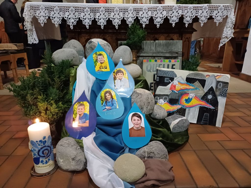 Das Motto „Quelle des Lebens“, begleitet die Kinder auf ihrer Vorbereitungszeit und weist ihnen wie auch uns den Weg. Die Taufe ist unsere Quelle des christlichen Lebens die nie versiegen möge.