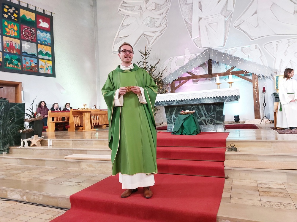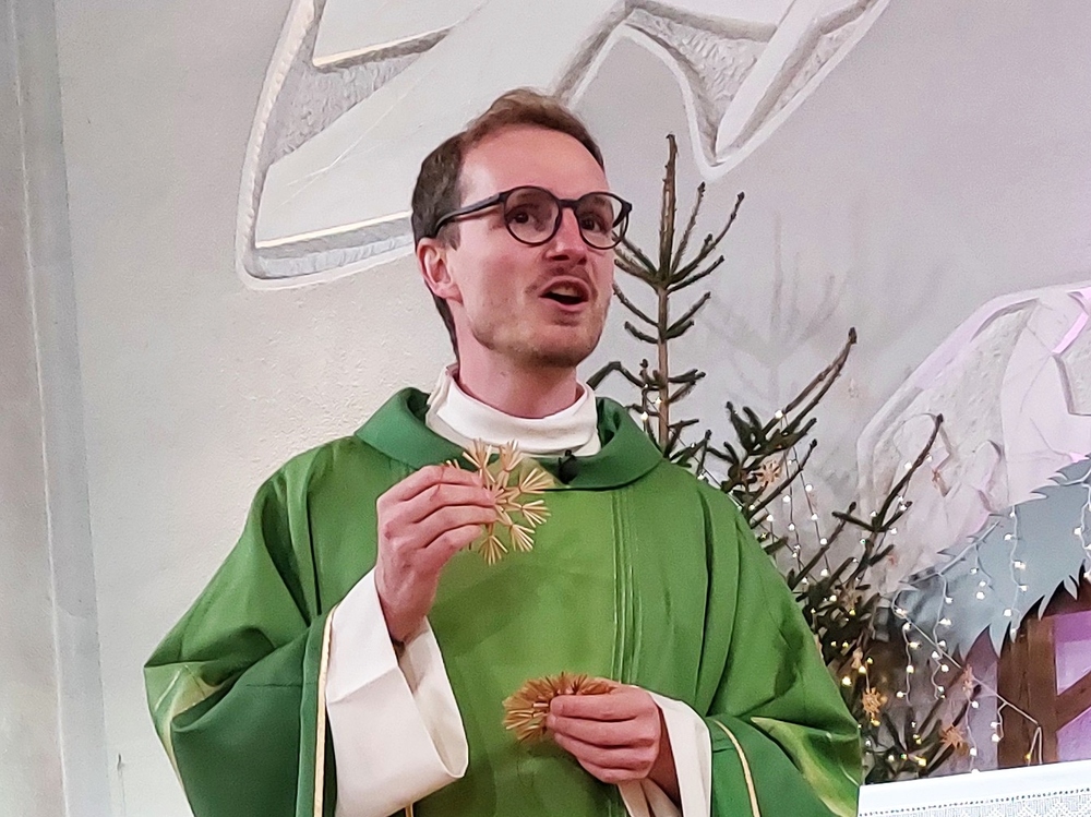 Pfarrer Mathias Bitsche stellte in der Predigt die Frage, was von Weihnachten bleibt, wenn die Feiertage vorüber sind. Anhand von drei Strohsternen lud er zu einer Spurensuche nach Gott im Alltag ein. Der Stern der Freude erinnert daran, anderen Menschen nicht nur zu Weihnachten Aufmerksamkeit und Freude zu schenken. Der Stern des Hinsehens macht deutlich, dass Gott kein ferner Gott ist, sondern im täglichen Leben entdeckt werden kann. Der Stern des Mutes und der Zuversicht verweist auf die Krippe und darauf, dass Gott unsere ganze Menschlichkeit annimmt – auch das Unfertige und Schwierige. Am Schluss lud Pfarrer Bitsche ein, einen Strohstern sichtbar im Alltag zu platzieren, als Erinnerung daran, Weihnachten durch Freude, aufmerksames Hinsehen und Menschlichkeit weiterzutragen.