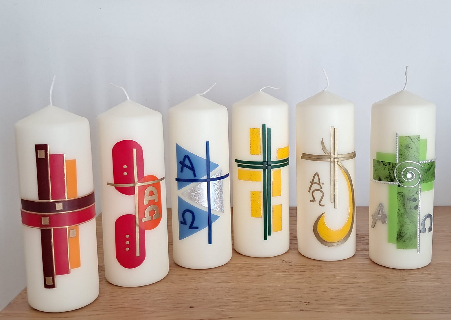 Auch heuer wurden von einem Team verschiedene Osterkerzen gestaltet. Wie im Bild zu sehen, stehen heuer wieder sechs verschiedene Motive zur Auswahl.
