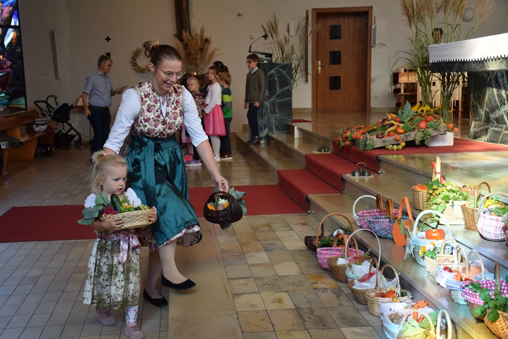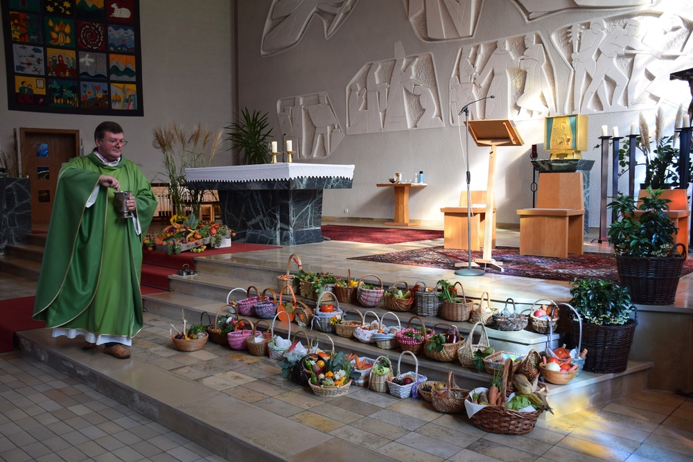Zum "Vater unser" wurden alle Kinder von Pfr. Cristinel eingeladen sich um den Altar zu versammeln, was gerne angenommen wurde. Am Schluss wurde alle Erntedankkörbe gesegnet, bevor sie wieder mit nach Hause mitgenommen wurden.