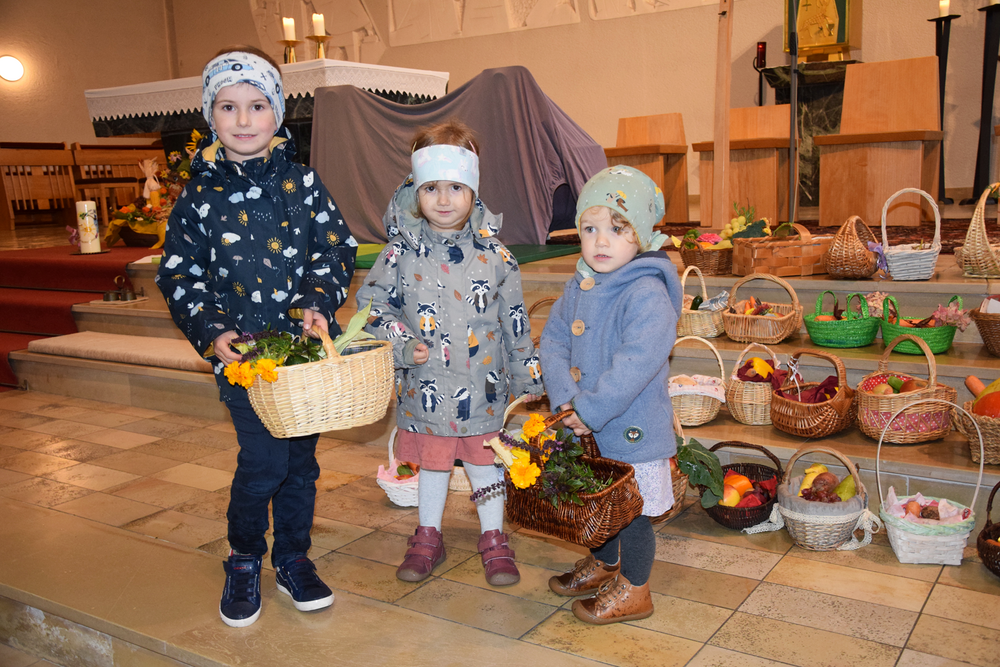 Kinder der Volksschule Muntlix sangen begeistert im Chor unter der Leitung von Pfarrer Thomas Gassner und der Gitarrenbegleitung von Wolfgang Kremmel. Nach der Predigt wurden die Erntedankkörbe gesegnet und mit nach Hause genommen.