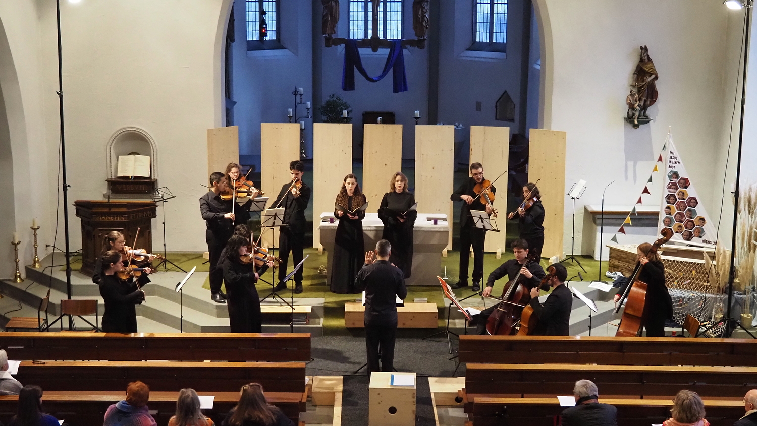 Alljährlich öffnet die Röthner Pfarrkirche in der Karwoche ihre Türen für die musikalische Einstimmung in die Karwoche. Vikar Willi begrüßt die Zuhörenden und betont, wie wichtig - in Zeiten von Krieg und Gewalt in der Welt - Frieden und (Mit-)Menschlichkeit sind. In der Musik sieht er eine besondere Sprache, zugleich auch eine Form des Gebets und ein Element, dass die Menschen verbindet und damit ein wichtiges und friedenstiftendes Zeichen setzt.