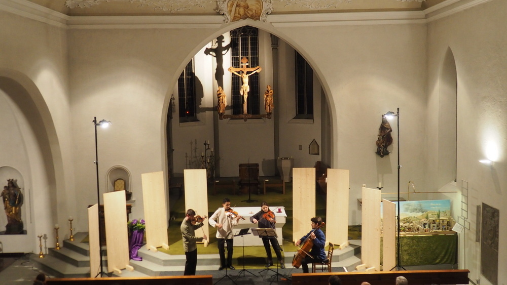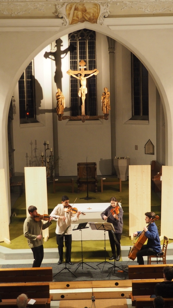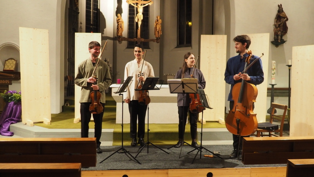 In der voll besetzten Röthner Pfarrkirche gaben die Musiker:innen ein brilliantes Konzert und präsentierten ihre ausgezeichneten Talente. Mit Werken von J. Haydn und F. Mendelssohn waren einzigartige Stücke zu hören. Neben dem Genuss für die Ohren faszinierte auch die Fingerfertigkeit sowie der emotionale Ausdruck der Vortragenden das Publikum. Die Moderatorin Dorit Wocher schaffte mit interessanten Details zu den Komponisten und deren Werken eine inhaltliche Verbindung und begleitete durch den Abend. Der Kirchenraum sowie die wunderschön beleuchtete Kreuzgruppe ergänzten die stimmige Kulisse zum Konzert in der Karwoche.