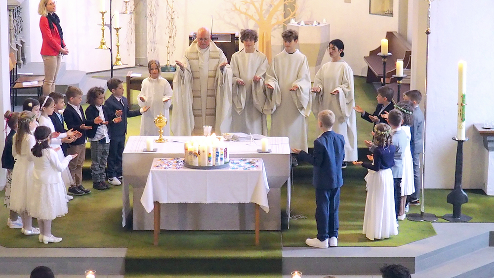 Bestens vorbereitet konnte somit am 5. Mai 2024 die erste Kommunion der Kinder gefeiert werden. Gemeinsam mit Vikar Willi Schwärzler durften 17 Erstkommunikanten bei feierlichem Orgelklang in eine festlich dekorierte Röthner Kirche einziehen.
