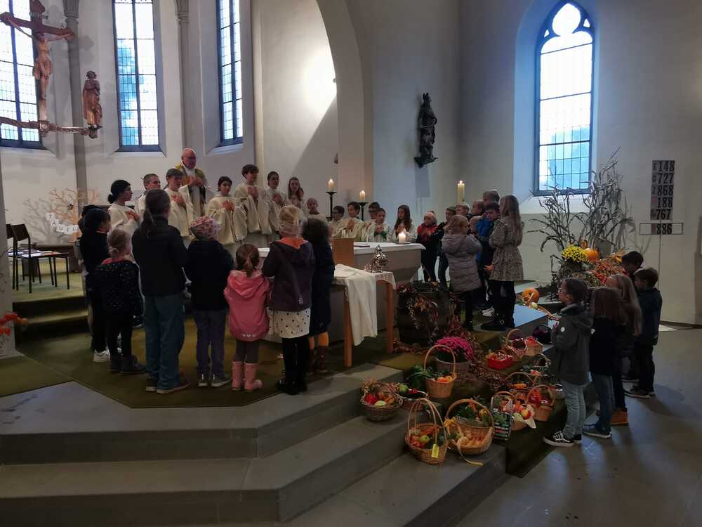 Viele Familien sind der Einladung zur Erntedankfeier gefolgt und haben ihre reichen Gaben zum Altar gelegt.