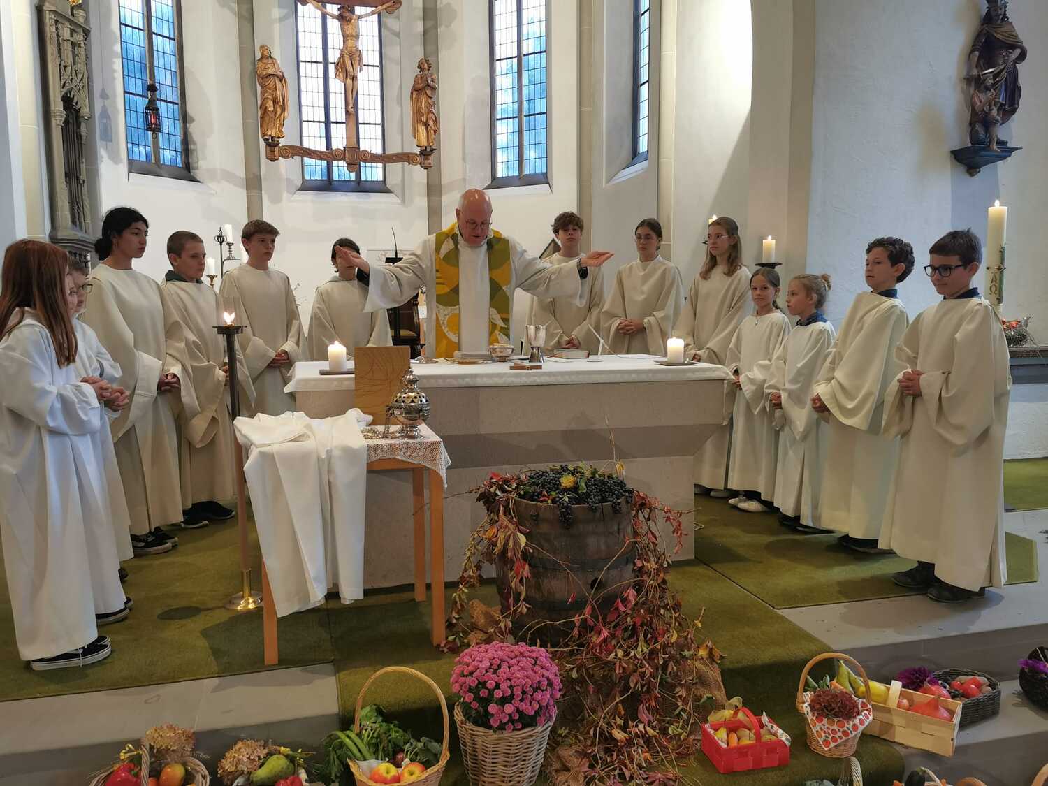 Trotz einiger kleiner Stolpersteinchen war es ein stimmiger Gottesdienst, der eingeladen hat, dankbar zu sein für die Früchte der Erde und der menschlichen Arbeit. Ebenso wichtig wie die Dankbarkeit ist das miteinander teilen und dadurch Licht sein für andere, wie Vikar Willi betonte. Wie Jesus den Jüngern diese schöne Aufgabe des "Licht seins für andere" übertragen hat, so dürfen die Ministranten:innen künftige Lichtbringer:innen im Gottesdienst und darüber hinaus sein. Mitgestaltet von den Ministranten:innen war der Gottesdienst lebendig. Ein besonderes Highlight ist es, wenn die zahlreichen Kinder das "Vater unser" gemeinsam mit Vikar Willi am Altar singend beten.