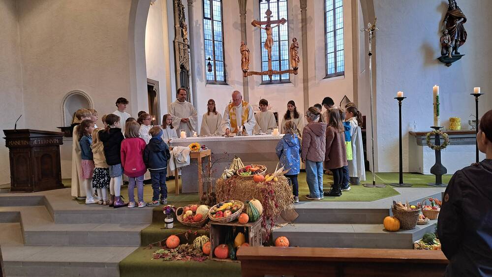 Nach dem Evangelium vom „Dankbaren Samariter“ (Lk 17,11–19) durften die frisch gekürten Minis die Fürbitten vorbringen und besondere Gaben an den Gabentisch bringen: ein Kreuz, eine Sonnenblume, Arbeitshandschuhe, ein Gewand, ein Licht, Weihrauch sowie eine Altarglocke. Die Ministrantenkinder erklärten die einzelnen Symbole. Traditionell segnete Vikar Willi die mitgebrachten Erntekörbchen. Musikalisch begleiteten Valentine und Veronika an zwei Gitarren durch die Feier.