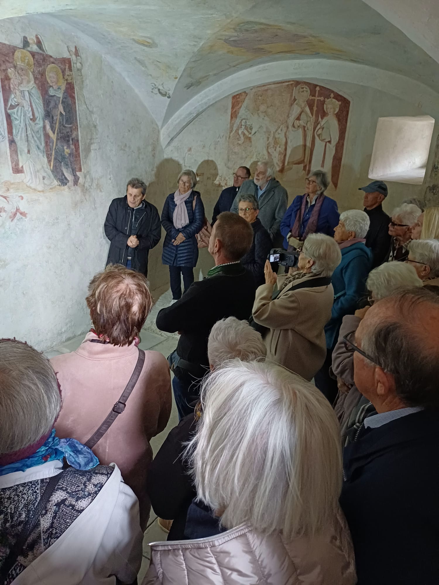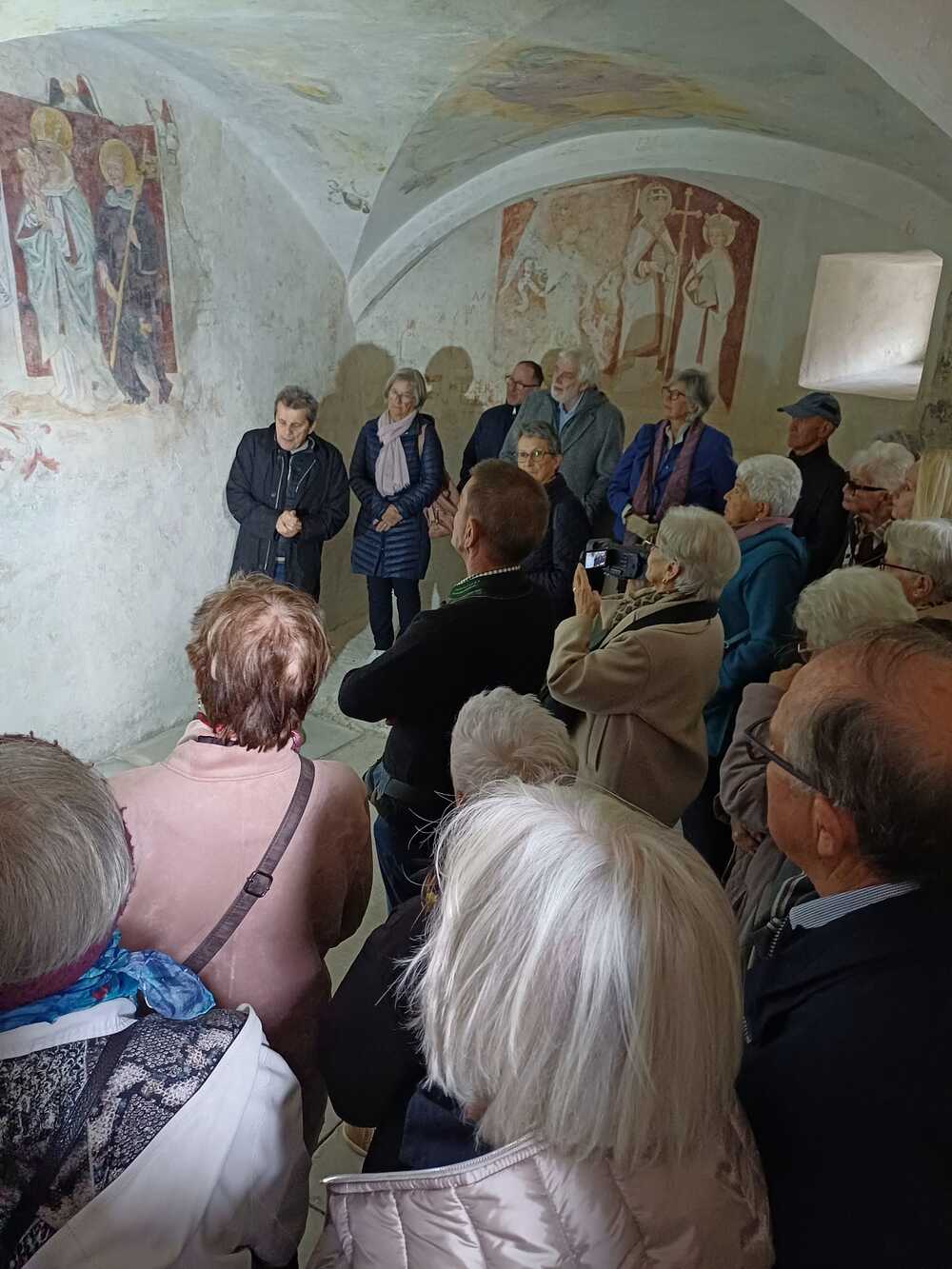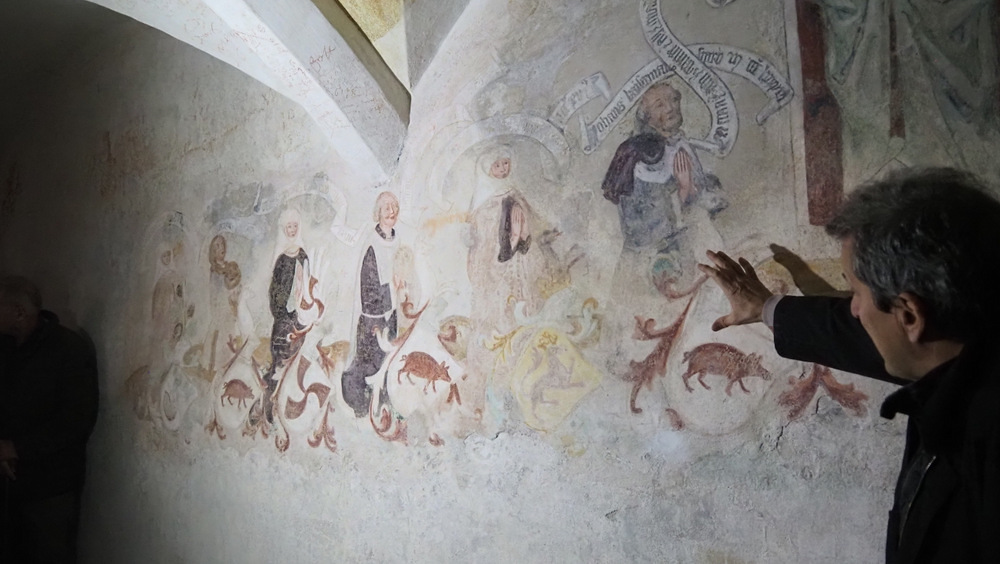 Besonders beeindruckend präsentierte sich auch die Michaelskapelle, wo noch gotische Fresken aus dem 15. Jahrhundert zu sehen sind – darunter eine Darstellung des Erzengels Michael im Jüngsten Gericht, die verschiedene Techniken der Wandmalereien sichtbar macht. Im Gegensatz zu der Sekkomalerei auf trockenem Untergrund wirken die Fresken, bei denen die Farbe auf nassen Putz aufgetragen wird, kräftiger und leuchtend.