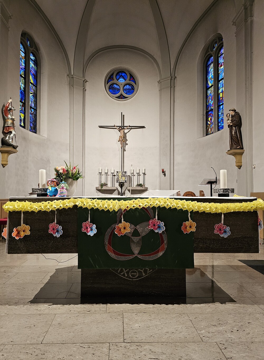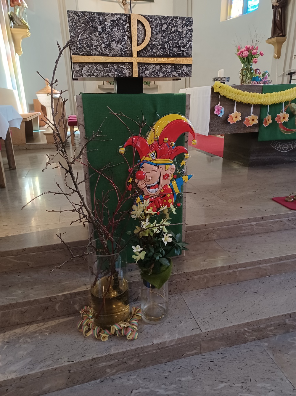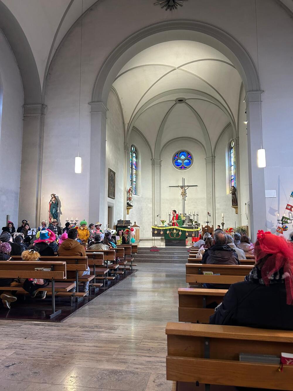 So präsentierte sich auch am Faschingssonntag unsere Pfarrkirche: geschmückt mit Girlanden, Luftballons und Clowns! Die Lieder und Texte waren humorvoll, zeigten Lebensfreude und Gemeinschaft.