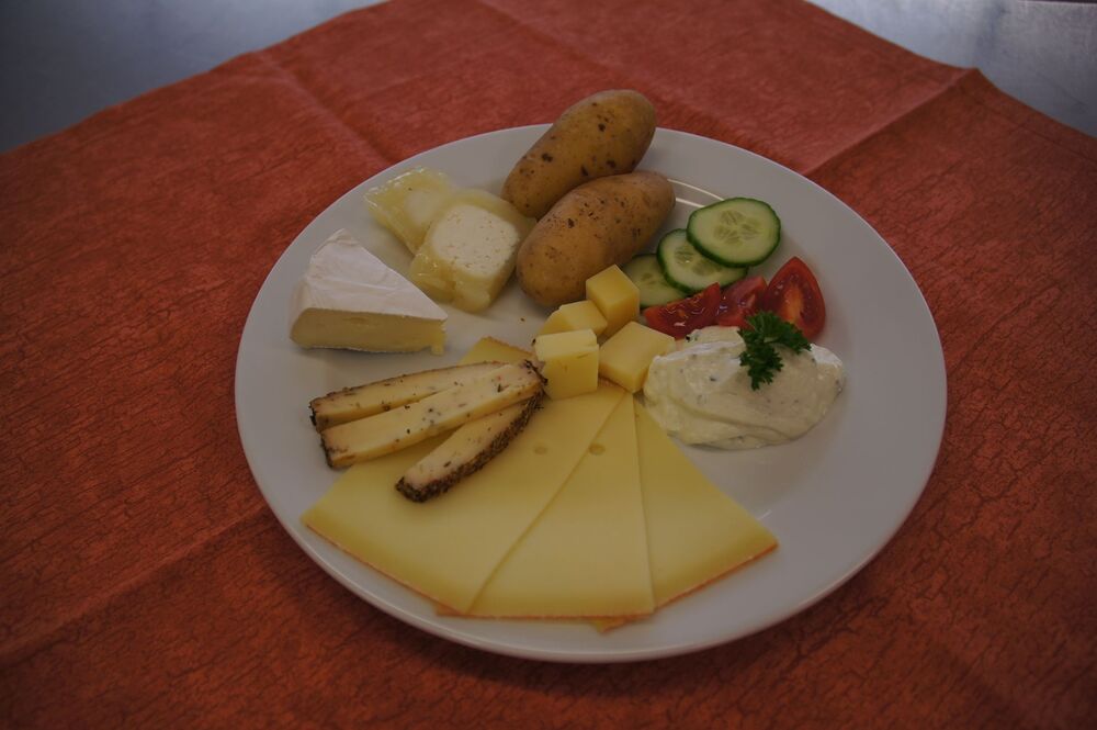 Dankbar für gutes Essen in Form von gekochten Erdäpfeln mit Butter, Käse und Aufstrich.