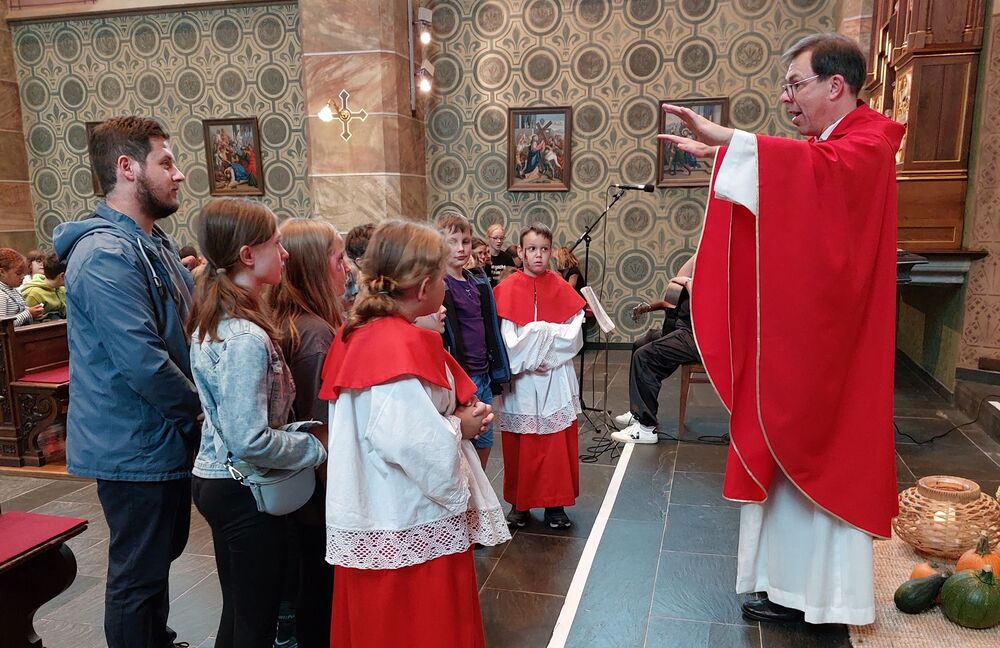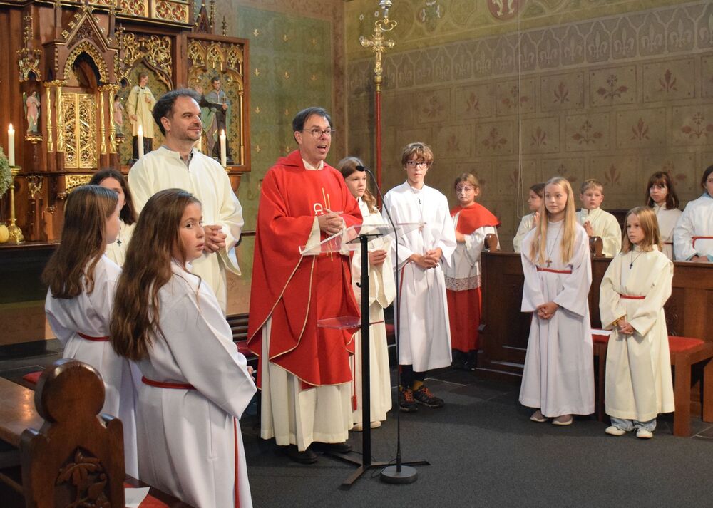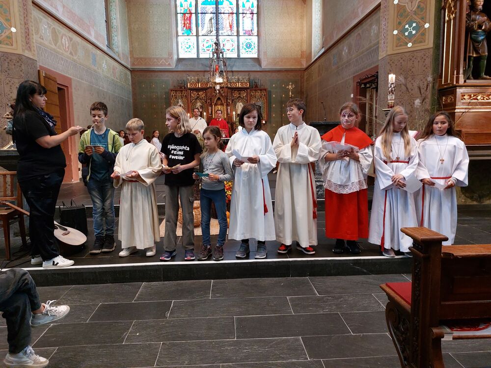 Ein abschließender Höhepunkt war dann um 14.00 Uhr die gemeinsame Abschlussmesse mit Dekan Rainer Büchel mit allen Ministrant/innen und Begleiter/innen in der Weiler Pfarrkirche. Aus jeder Pfarre ministierten 2 Ministranten, was zu einer festlichen Stimmung mit 20 Minis aus der ganzen Region führte. Musikalisch begleitet wurde der Gottesdienst von Jacqueline Haller und einer Abordnung ihrer „Montfort Voices“ sowie von Silke Vögel an der Orgel. Beim abschließenden Einzelsegen von Dekan Rainer für jede einzelne Minigruppe wurden die Minis und ihre engagierten BegleiterInnen wieder gesendet zu ihrem so wichtigen Dienst in den Pfarren.