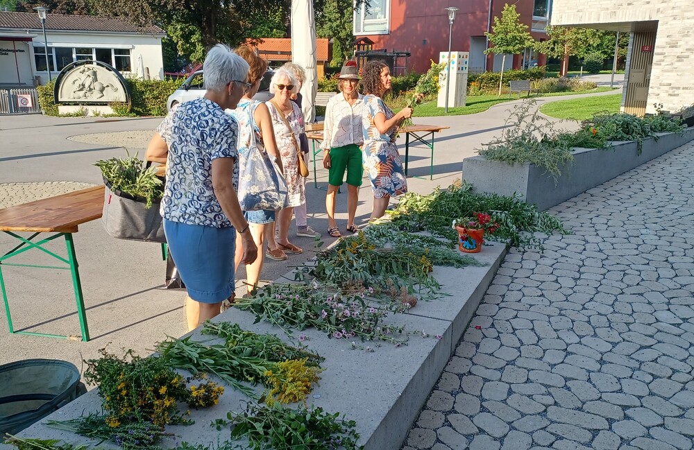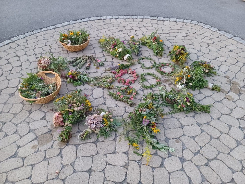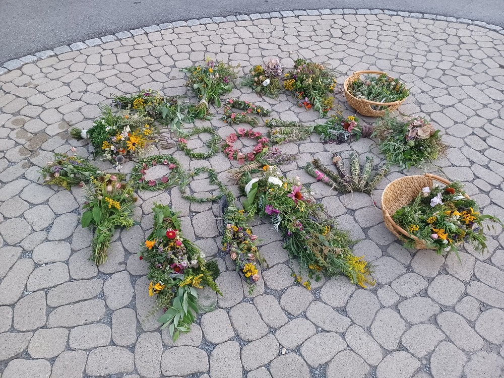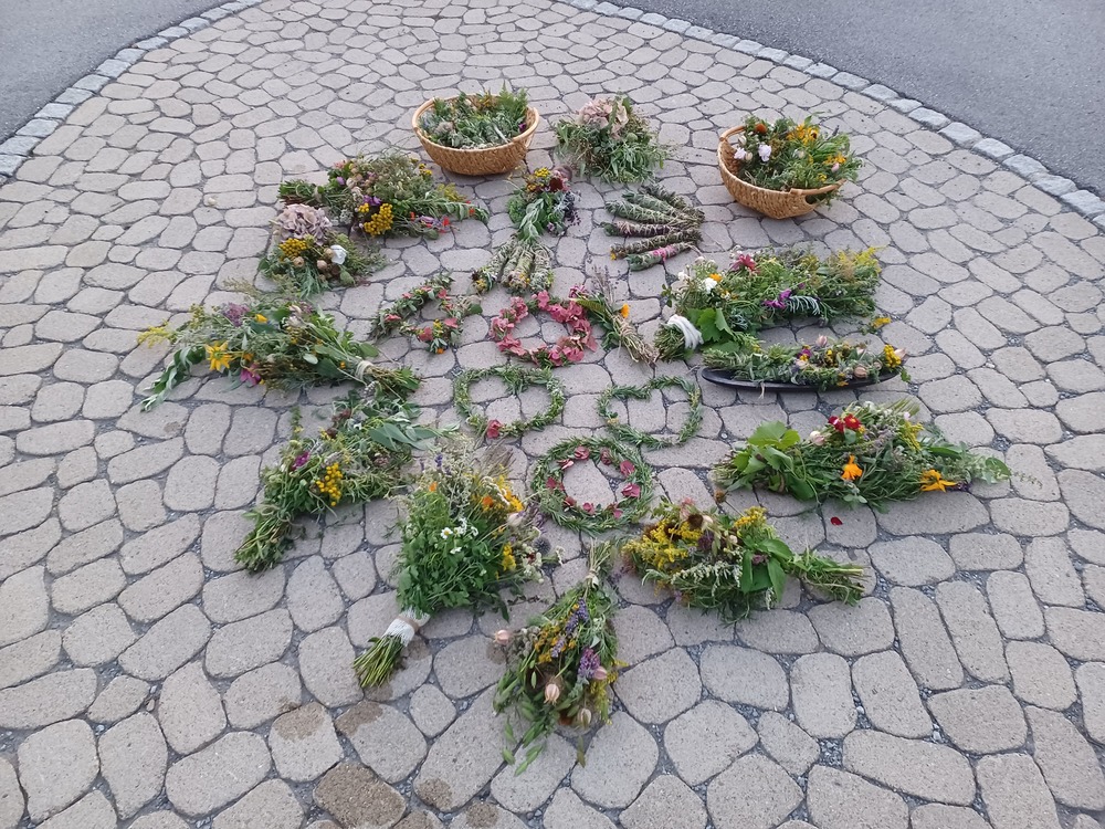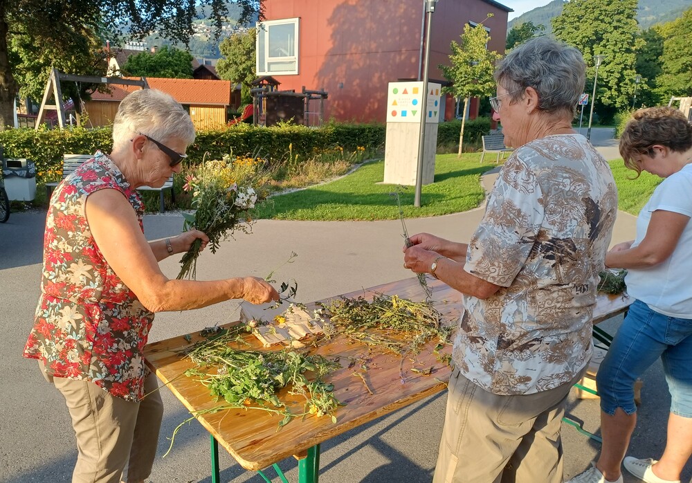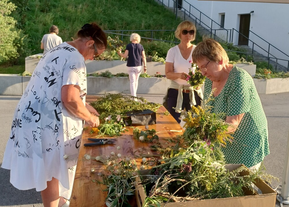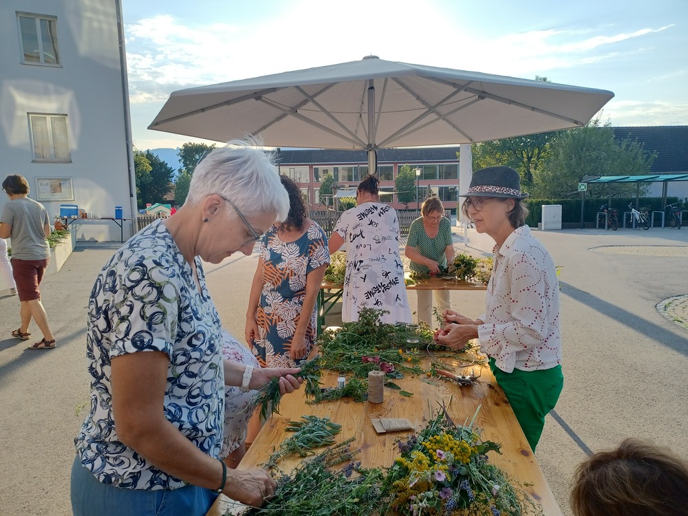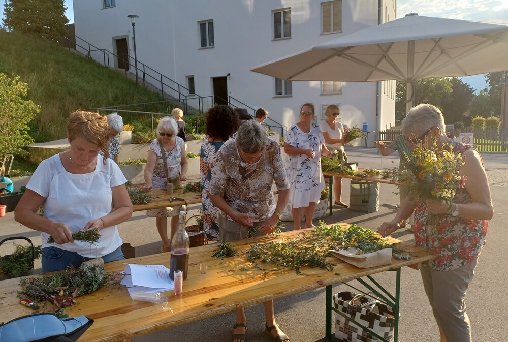 Am Vorabend des Feiertages Maria Himmelfahrt, 15. August, trafen sich interessierte Frauen zum Räucherbündel und Kräuterbuschen binden auf dem Platz vor dem Pfarrhaus. Der feine Sommerabend bot eine besondere Atmosphäre für diese medidative Handarbeit.