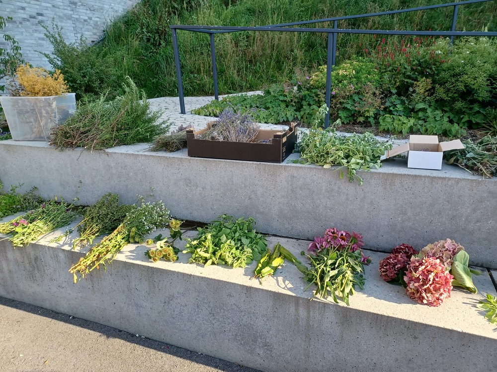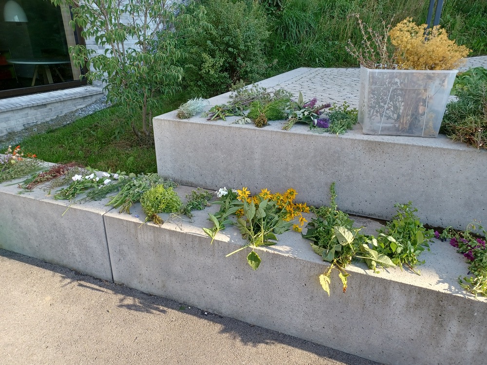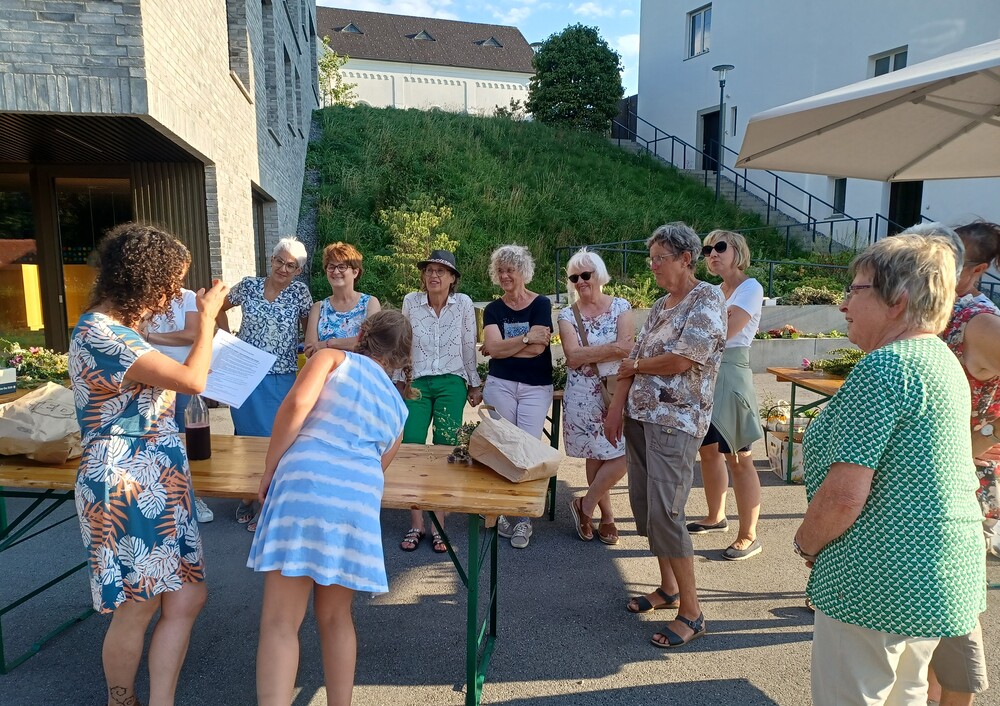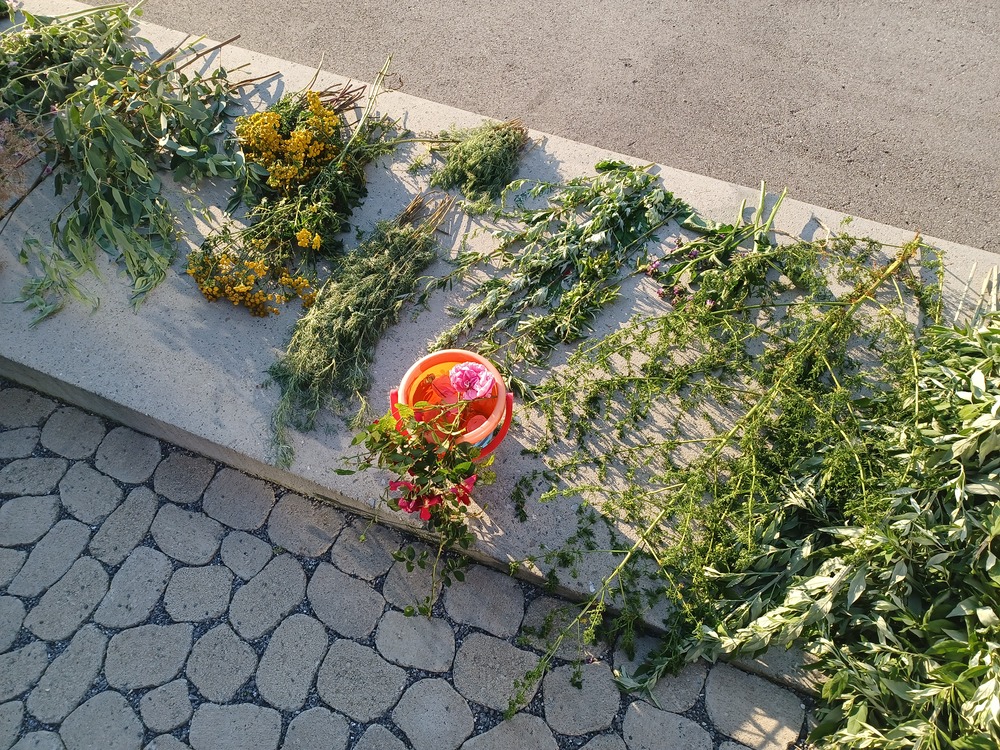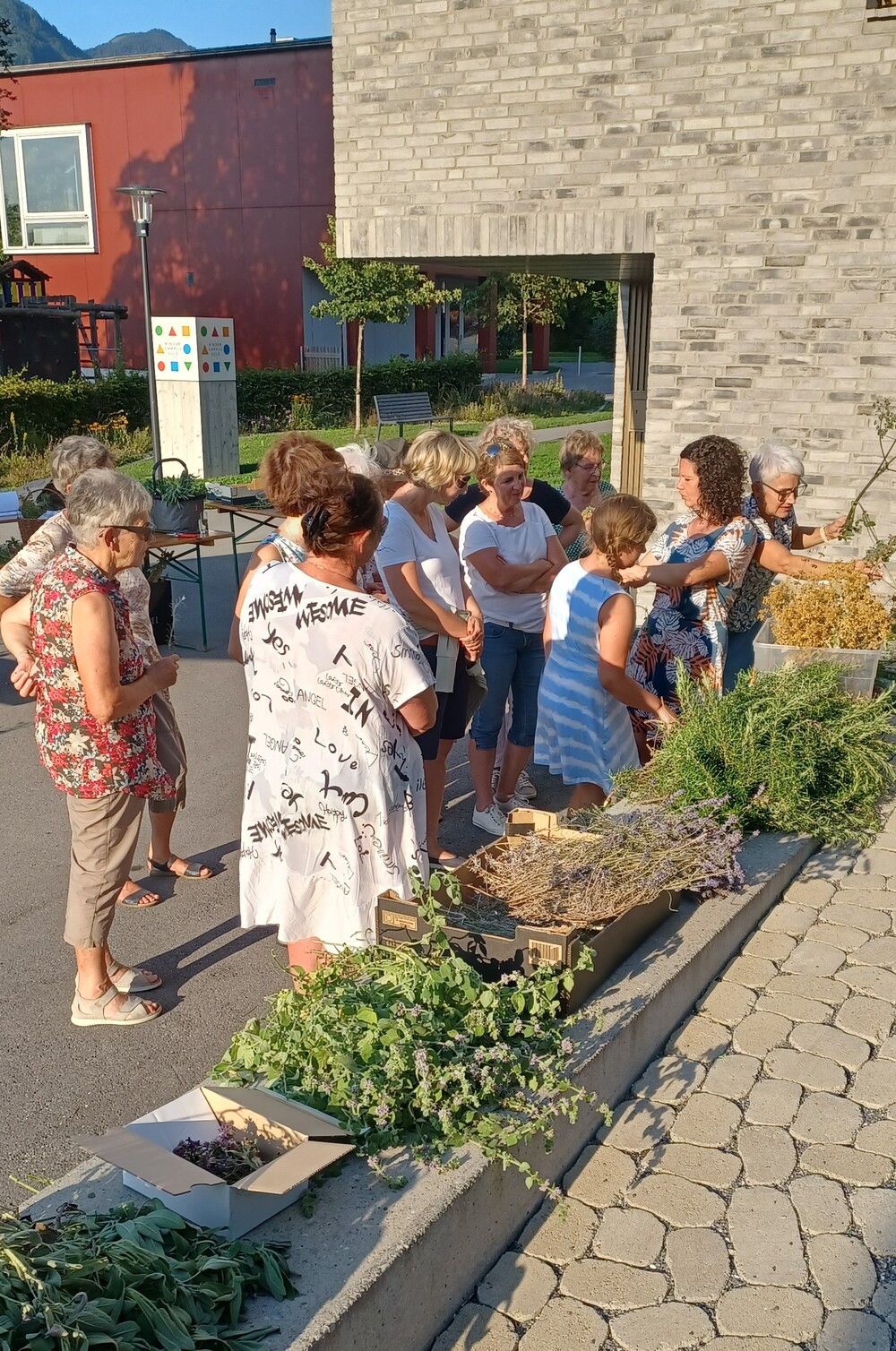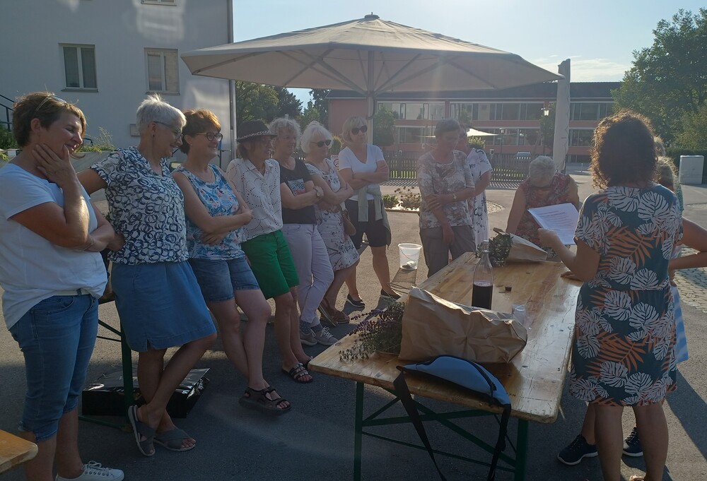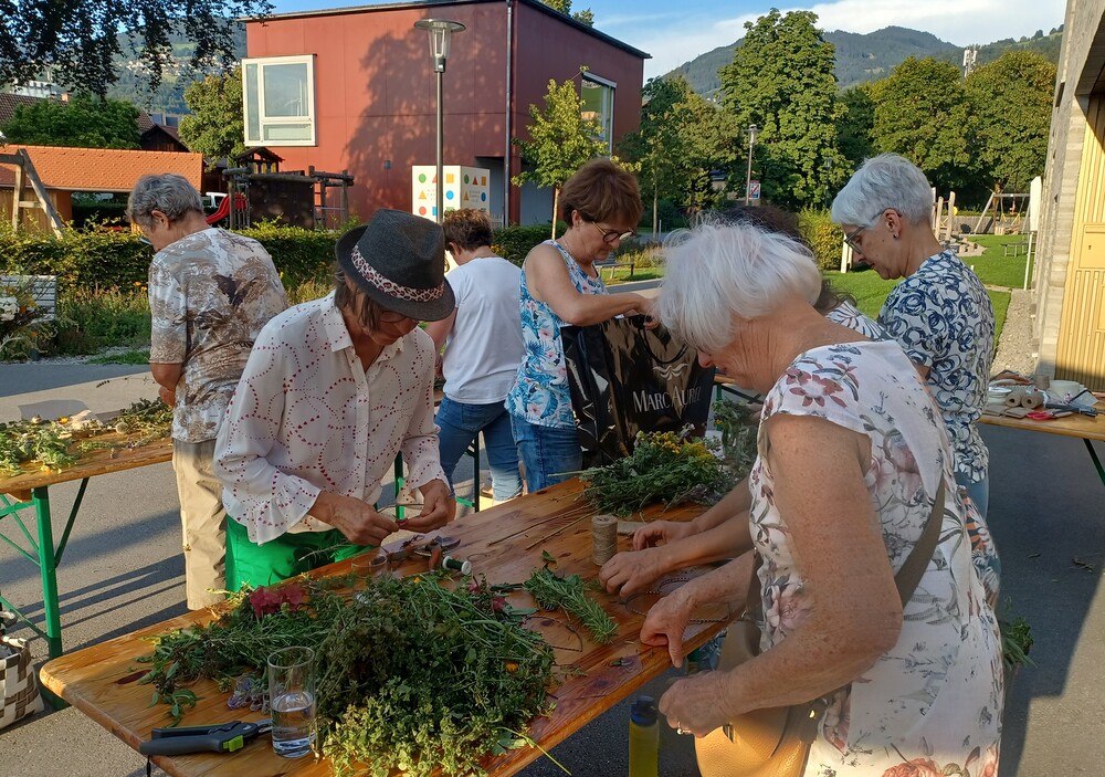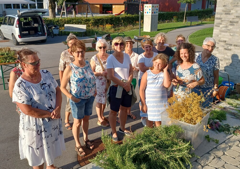 Am Vorabend des Feiertages Maria Himmelfahrt, 15. August, trafen sich interessierte Frauen zum Räucherbündel und Kräuterbuschen binden auf dem Platz vor dem Pfarrhaus. Der feine Sommerabend bot eine besondere Atmosphäre für diese medidative Handarbeit.