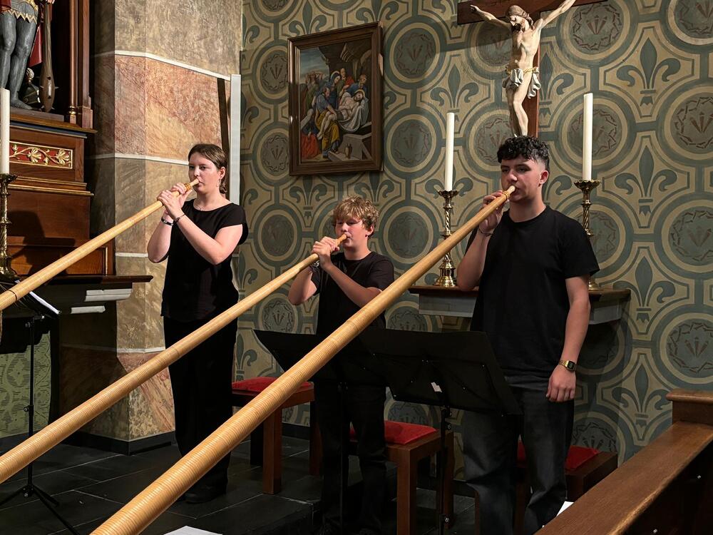 Das Alphornbläser-Trio entführte die Konzertbesucher:innen in den musikalischen Zauberwald, wo sich das junge Mädchen "Allerleihrauh" versteckte, um der Hochzeit mit dem König, ihrem Vater, zu entfliehen.
